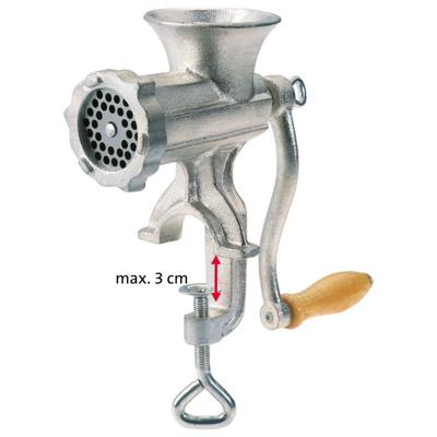 Kjøttkvernen festes enkelt til bordkanten med den innebygde skrumekanismen og står stødig under bruk. Håndtaket er laget av tre og gir et godt og behagelig grep.