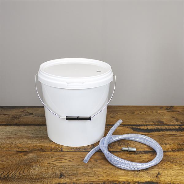 - 1 stk tappespand med hank og låg, 10 liter, hvid med tætsluttende låg. Låget er forboret med hul til tappeslangen.