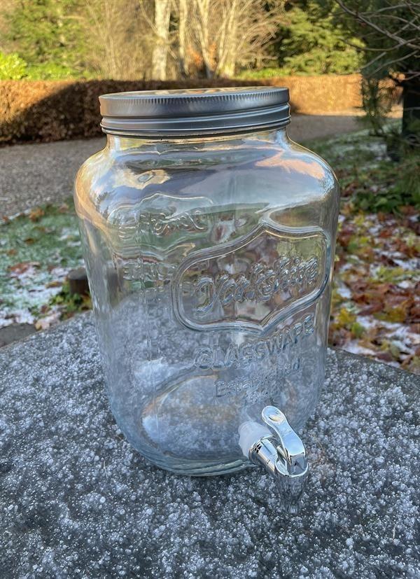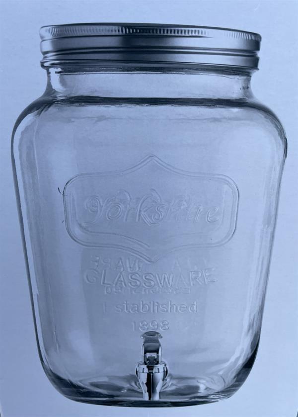 Denne dekorative krukke/beholder af kraftigt glas med tappehane i en praktisk størrelse kan også bruges til brygning af kombucha, udskænkning af lemonade, most og saft samt andre drikkevarer.